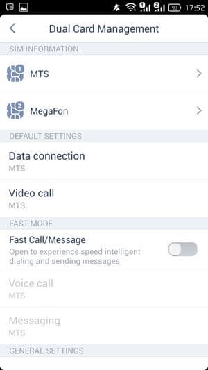 Смартфон поддерживает работу с двумя SIM-картами, и в целом работа с ними в меню организована по знакомому принципу: можно любую из SIM-карт назначить основной для организации голосовых звонков, передачи данных или отправки SMS-сообщений; при наборе номера также можно выбрать желаемую карту в контекстном графическом подменю путем «сдвига бегунка» (правда, об этой возможности как-то не сразу догадываешься). С сетями 3G может работать SIM-карта в любом слоте, однако одновременно в этом режиме может работать лишь одна из карт (вторая будет работать только в 2G). Для смены назначений слотов менять местами карточки не требуется — это можно сделать прямо из меню телефона. Работа с двумя SIM-картами организована по привычному стандарту Dual SIM Dual Standby, когда обе карты могут находиться в активном режиме ожидания, но одновременно работать не могут — радиомодуль здесь только один.