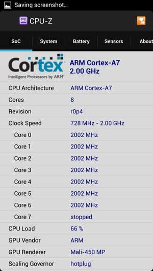 - SoC MediaTek MT6592, 2,0 ГГц, 8 ядер, ARM Cortex-A7