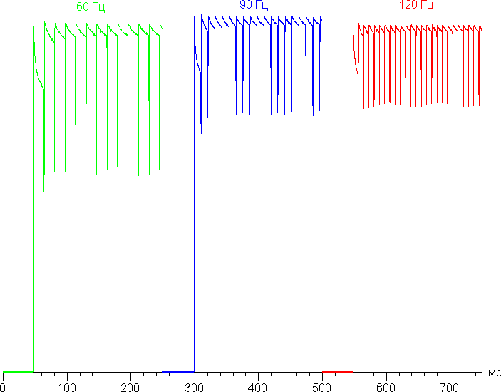 На высоком и среднем уровне яркости присутствует значимая модуляция с частотой примерно 60, 90 или 120 Гц. На рисунках ниже приведены зависимости яркости (вертикальная ось) от времени (горизонтальная ось) для нескольких значений настройки яркости. Сначала для режима с частотой обновления 60 Гц: