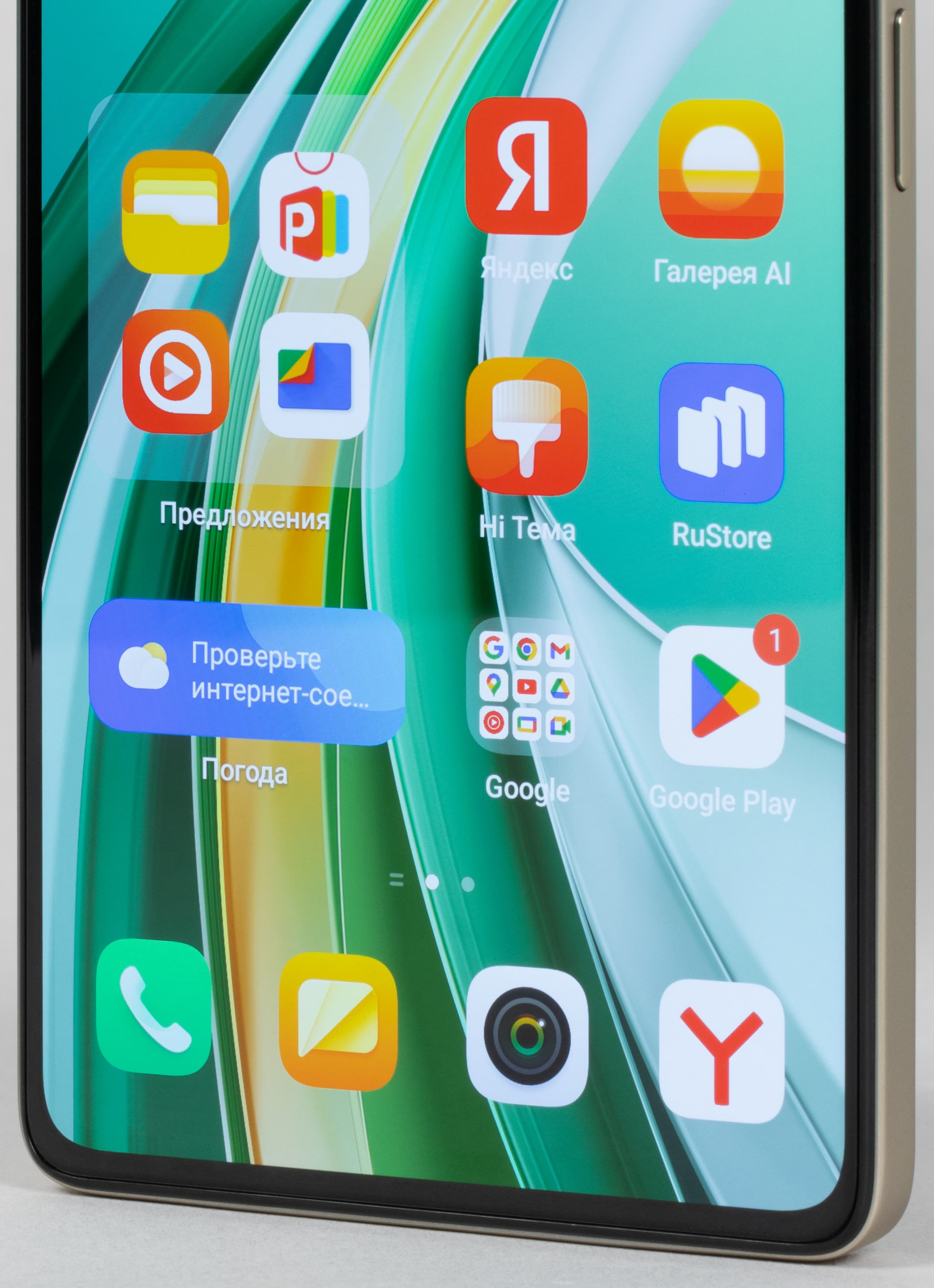 При ручном управлении яркостью и при выводе белого поля во весь экран максимальное значение яркости составило примерно 540 кд/м² в обычных условиях, на очень ярком свету при включенной опции Режим высокой яркости оно может повышаться до 1000 кд/м². В любом случае максимальная яркость очень высокая. В данном случае чем меньше площадь белого на экране, тем он светлее, то есть фактическая максимальная яркость белых участков будет почти всегда еще выше. В итоге, учитывая отличные антибликовые свойства, читаемость днем на солнце, должна быть на приемлемом уровне, а темная тема не только экономит заряд аккумулятора, но способствует лучшей разборчивости информации на экране в условиях высокой освещенности. Минимальное значение яркости при ручном управлении — 4,5 кд/м², то есть пониженный уровень яркости без проблем позволяет использовать устройство даже в полной темноте. Есть автоматическая регулировка яркости по датчику освещенности (он находится на фронтальной панели близко к ее верхнему краю правее решетки фронтального громкоговорителя). В автоматическом режиме при изменении внешних условий освещенности яркость экрана как повышается, так и понижается. Работа этой функции зависит от положения ползунка регулировки яркости: им пользователь может попытаться выставить желаемый уровень яркости в текущих условиях. Если оставить все по умолчанию, то в полной темноте функция автояркости уменьшает яркость до 4,5 кд/м² (очень темно), в условиях освещенного искусственным светом офиса (примерно 550 лк) устанавливает на 130 кд/м² (нормально), а условно под прямыми лучами солнца повышает до 1000 кд/м² (до максимума, так и нужно). Результат по умолчанию нас не удовлетворил, поэтому мы попробовали повысить яркость в полной темноте. Яркость стала выше, но после цикла повышения внешней освещенности и ее снижения, все вернулось к тем же значениям, что были до вмешательства. Получается, что функция автоподстройки яркости работает более-менее адекватно, но не позволяет пользователю настраивать свою работу под индивидуальные требования.