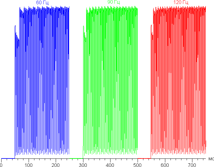 В режимах 90 и 120 Гц плавность прокрутки заметно повышается. Характер модуляции при этом не меняется.