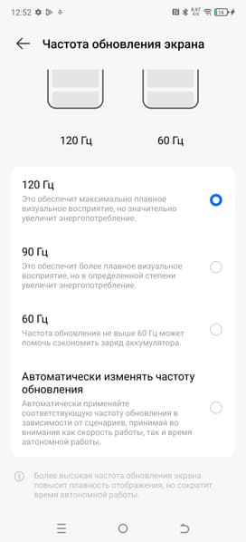 В настройках экрана можно включить режим с повышенной до 90 и 120 Гц частотой обновления: