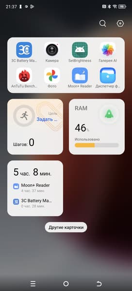 При ручном управлении яркостью и при выводе белого поля во весь экран максимальное значение яркости составило примерно 580 кд/м². Максимальная яркость очень высокая. В данном случае чем меньше площадь белого на экране, тем он светлее, то есть фактическая максимальная яркость белых участков будет почти всегда еще выше. В итоге, учитывая отличные антибликовые свойства, читаемость днем на солнце, должна быть на приемлемом уровне, а темная тема не только экономит заряд аккумулятора, но способствует лучшей разборчивости информации на экране в условиях высокой освещенности. Минимальное значение яркости при ручном управлении — 3 кд/м², то есть пониженный уровень яркости без проблем позволяет использовать устройство даже в полной темноте. Есть автоматическая регулировка яркости по датчику освещенности (он расположен под экраном близко к верхнему краю правее центра по горизонтали). В автоматическом режиме при изменении внешних условий освещенности яркость экрана как повышается, так и понижается. Работа этой функции зависит от положения ползунка регулировки яркости: им пользователь может попытаться выставить желаемый уровень яркости в текущих условиях. Если оставить все по умолчанию, то в полной темноте функция автояркости уменьшает яркость до 20 кд/м² (подходит), в условиях освещенного искусственным светом офиса (примерно 550 лк) устанавливает на 200 кд/м² (нормально), а условно под прямыми лучами солнца повышает до 580 кд/м² (до максимума, так и нужно). Результат нас устроил, но для пробы в полной темноте мы снизили яркость. Однако после цикла повышения внешней освещенности и ее снижения, все вернулось к тем же значениям, что были до вмешательства. Получается, что функция автоподстройки яркости работает более-менее адекватно, но не позволяет пользователю настраивать свою работу под индивидуальные требования.