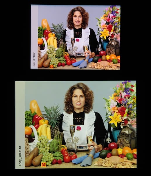Отметим хорошую равномерность яркости и цветового тона белого поля (за исключением едва видимого затемнения и изменения оттенка к загнутым краям).