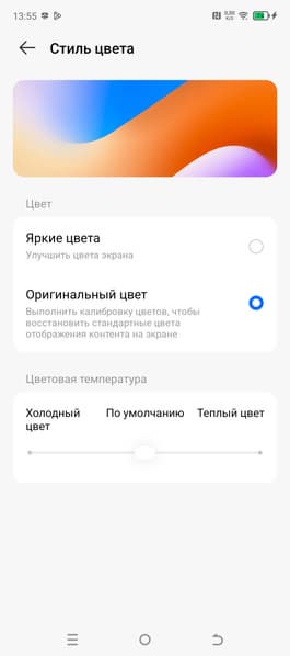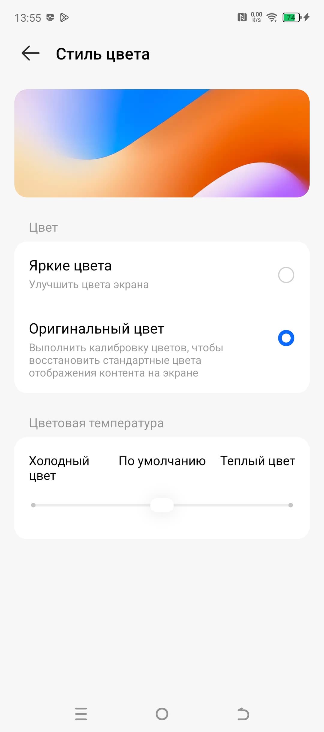 Отметим, что на экранах с уширенным цветовым охватом (без соответствующей коррекции) цвета́ обычных изображений, оптимизированных для устройств sRGB, выглядят неестественно насыщенными. Отсюда и рекомендация: в большинстве случаев смотреть кино, фотографии и все естественное лучше при выборе профиля Оригинальный цвет с использованием штатной программы Галерея AI. Но не исключено, что есть и другие программы, которые могут корректировать цветовой охват в соответствии с возможностями экрана.