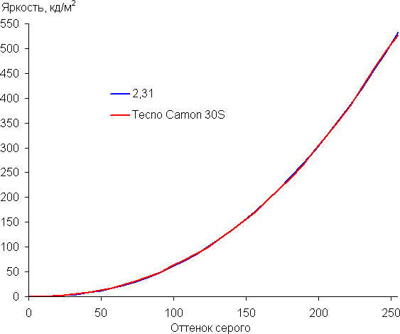Напомним, что в случае OLED-экранов яркость фрагментов изображения динамично меняется в соответствии с характером выводимого изображения — слегка уменьшается для светлых в целом изображений. В итоге полученная зависимость яркости от оттенка (гамма-кривая), скорее всего, немного не соответствует гамма-кривой статичного изображения, так как измерения проводились при последовательном выводе оттенков серого почти на весь экран.