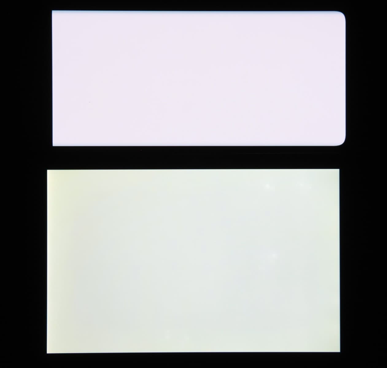 Экран характеризуется великолепными углами обзора. Яркость под углом у двух экранов (если сравнивать еще и с Nexus 7) уменьшается, но в случае смартфона падение яркости выражено гораздо меньше. В итоге, даже если установить формально одинаковую яркость, экран этого смартфона визуально выглядит гораздо более ярким (в сравнении с ЖК-экранами), так как на экран мобильного устройства часто приходится смотреть как минимум под небольшим углом. Правда, белый цвет при отклонении на большие углы приобретает легкий сине-зеленый оттенок. Черный цвет у смартфона остается просто черным под любыми углами. Он настолько черный, что параметр контрастности в данном случае неприменим. Для сравнения приведем фотографии, на которых на экран смартфона и экран второго участника (Nexus 7; снизу — Nexus 7, сверху — смартфон) выведены одинаковые изображения, при этом яркость экранов изначально установлена примерно на 200 кд/м², а цветовой баланс на фотоаппарате принудительно переключен на 6500 К.