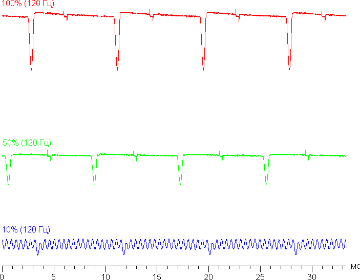 Частота модуляции на высокой и средней яркости увеличилась до 120 Гц, а на низкой характер модуляции такой же, как и в случае частоты обновления 60 Гц. Повторим: видимого мерцания нет.