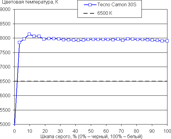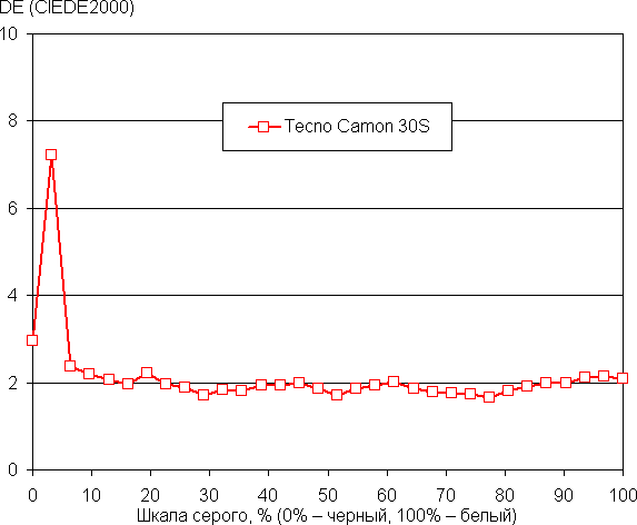 (Самые темные области шкалы серого в большинстве случаев можно не учитывать, так как там баланс цветов не имеет большого значения, да и погрешность измерений цветовых характеристик на низкой яркости большая.) В этом устройстве есть возможность скорректировать цветовой баланс регулировки цветовой температуры, но при eё снижении растет ΔE, поэтому заниматься такой коррекцией смысла нет.