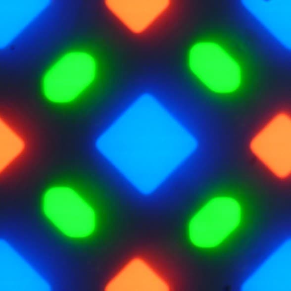 В этом экране используется матрица AMOLED — активная матрица на органических светодиодах. Полноцветное изображение создается с помощью субпикселей трех цветов — красного (R), зеленого (G) и синего (B), но красных и синих субпикселей в два раза меньше, что можно обозначить как RGBG. Это подтверждается фрагментом микрофотографии:
