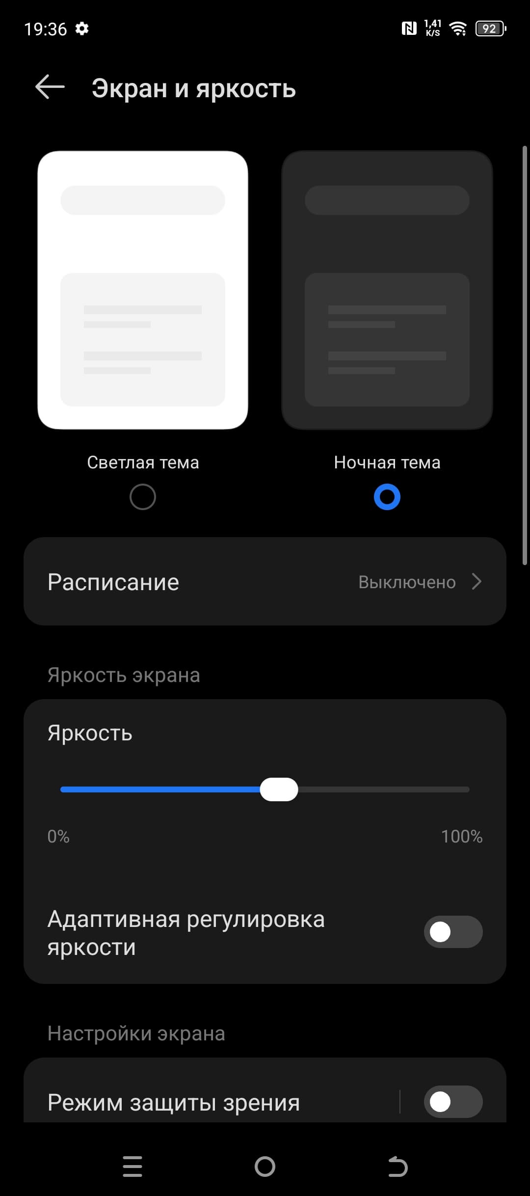 При ручном управлении яркостью и при выводе белого поля во весь экран максимальное значение яркости составило примерно 530 кд/м² в обычных условиях, на очень ярком свету при включенной опции Режим высокой яркости оно может повышаться до 970 кд/м². В любом случае максимальная яркость очень высокая. В данном случае чем меньше площадь белого на экране, тем он светлее, то есть фактическая максимальная яркость белых участков будет почти всегда еще выше. В итоге, учитывая отличные антибликовые свойства, читаемость днем на солнце, должна быть на приемлемом уровне, а темная тема не только экономит заряд аккумулятора, но способствует лучшей разборчивости информации на экране в условиях высокой освещенности. Минимальное значение яркости при ручном управлении — 2 кд/м², то есть пониженный уровень яркости без проблем позволяет использовать устройство даже в полной темноте. Есть автоматическая регулировка яркости по датчику освещенности (он расположен под экраном близко к верхнему краю правее камеры). В автоматическом режиме при изменении внешних условий освещенности яркость экрана как повышается, так и понижается. Работа этой функции зависит от положения ползунка регулировки яркости: им пользователь может попытаться выставить желаемый уровень яркости в текущих условиях. Если оставить все по умолчанию, то в полной темноте функция автояркости уменьшает яркость до 2 кд/м² (очень темно), в условиях освещенного искусственным светом офиса (примерно 550 лк) устанавливает на 120 кд/м² (нормально), а условно под прямыми лучами солнца повышает до 970 кд/м² (до максимума, так и нужно). Результат по умолчанию нас не удовлетворил, поэтому мы попробовали повысить яркость в полной темноте. Яркость стала выше, но после цикла повышения внешней освещенности и ее снижения, все вернулось к тем же значениям, что были до вмешательства. Получается, что функция автоподстройки яркости работает более-менее адекватно, но не позволяет пользователю настраивать свою работу под индивидуальные требования.