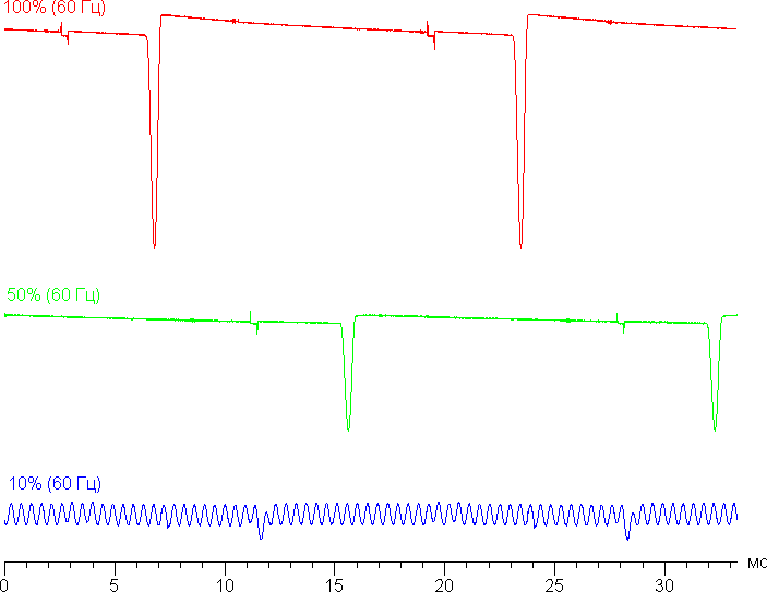 На высоком и среднем уровне яркости присутствует значимая модуляция с частотой 60 или 120 Гц. На рисунках ниже приведены зависимости яркости (вертикальная ось) от времени (горизонтальная ось) для нескольких значений настройки яркости. Сначала для режима с частотой обновления 60 Гц: