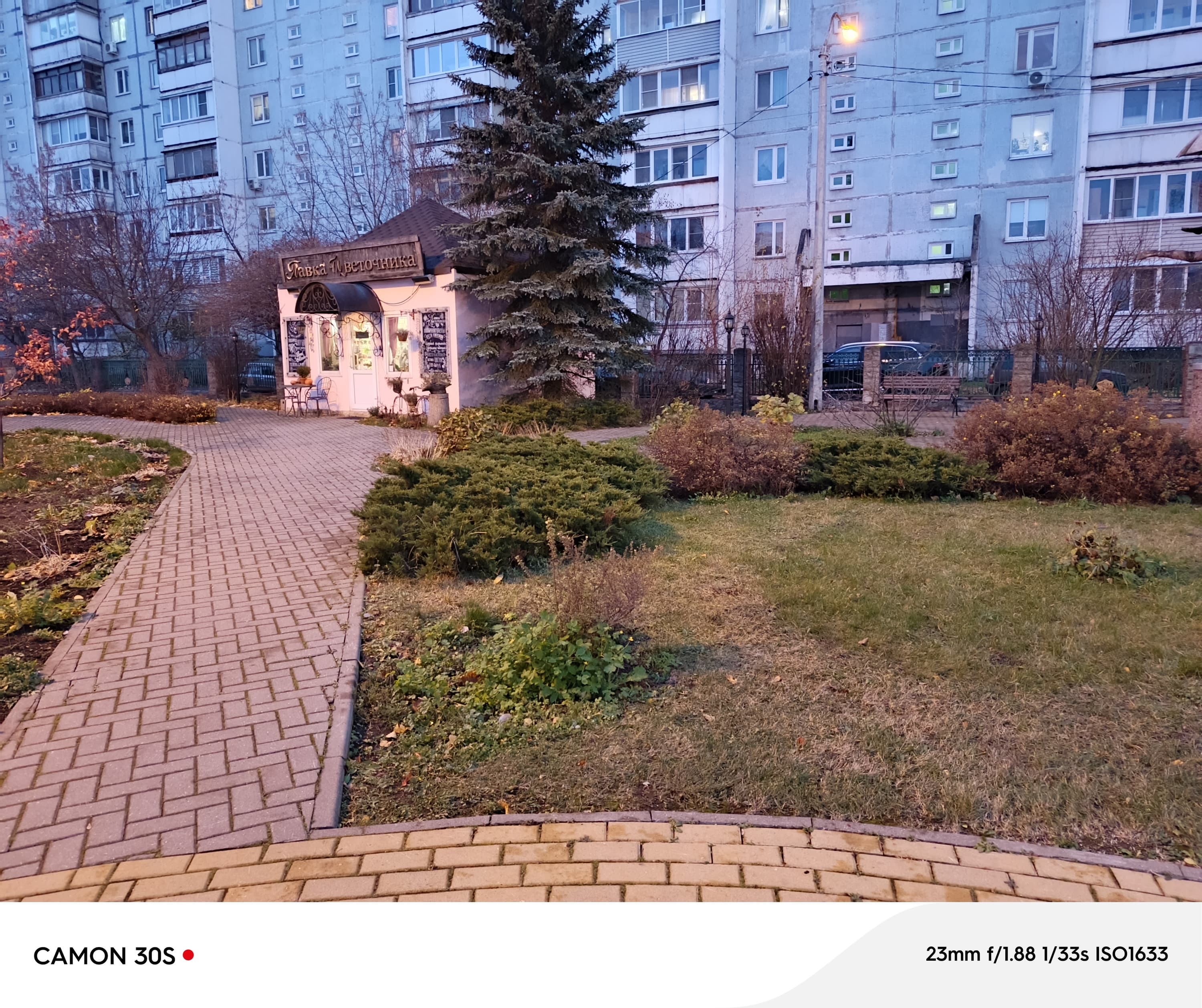 12,5-мегапиксельные же фотографии обеспечивают очень неплохое качество изображения при хорошем освещении, детализация вполне солидная, резкость нормальная и без явных намеков на выкрученный шарпинг, картинка приятная, без артефактов, пересветов и провалов текстур в тенях не наблюдается. Но как только ухудшается освещение, и уж тем более в сгущающихся сумерках, детализация падает катастрофически. Все эти оценки справедливы, разумеется, для смартфонов обычного среднего уровня, флагманским качеством тут и не пахнет.