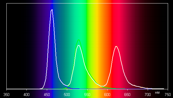 В первом случае спектры компонент (то есть спектры чистых красного, зеленого и синего цветов) очень хорошо разделены:
