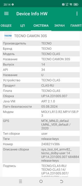 Основные характеристики Tecno Camon 30S (модель CLA5)