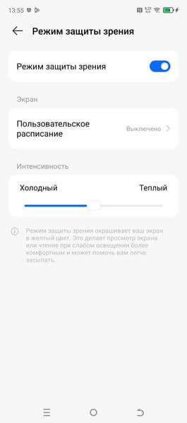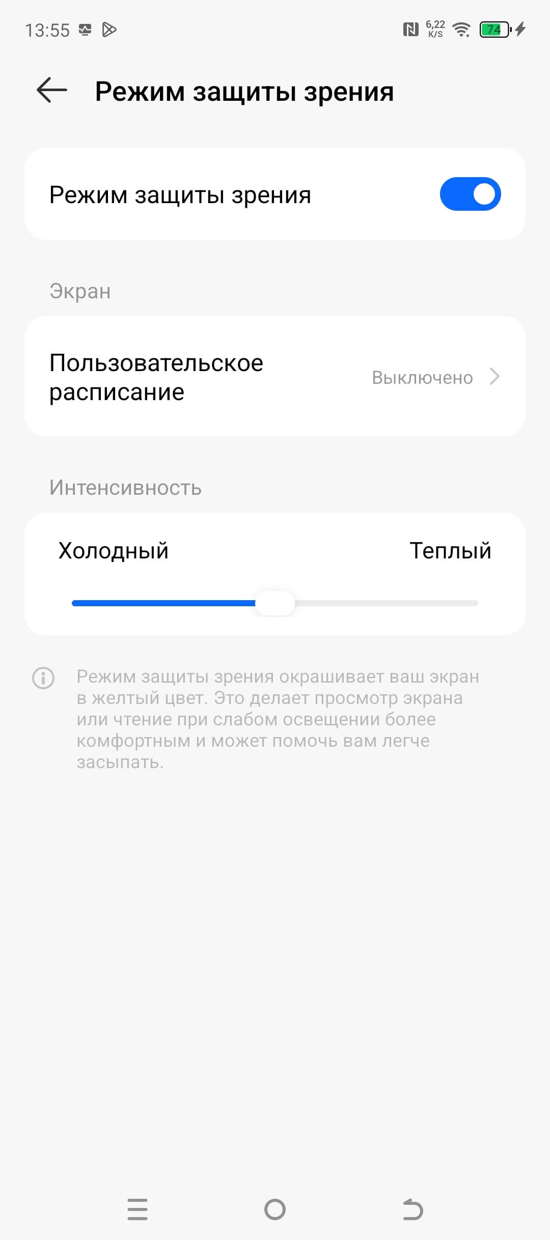 Разумеется, присутствует настройка (Режим защиты зрения), позволяющая снизить интенсивность синей компоненты. В принципе, яркий свет может приводить к нарушению суточного (циркадного) ритма (см. статью про iPad Pro с дисплеем 9,7 дюйма), но все решается снижением яркости до низкого, но еще комфортного уровня, а искажать цветовой баланс, уменьшая вклад синего, нет абсолютно никакого смысла.