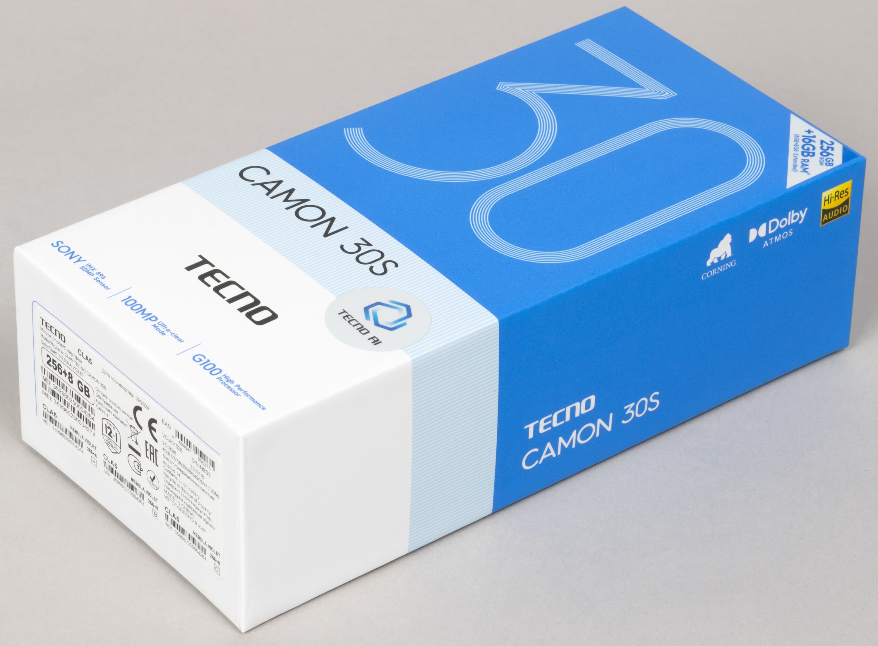Смартфон Tecno Camon 30S поставляется в картонной коробке с обычным оформлением без прикрас.