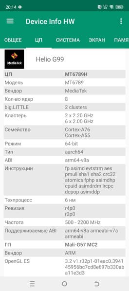 - SoC Mediatek Helio G100, 8 процессорных ядер (2×Cortex-A76 @2,2 ГГц + 6×Cortex-A55 @2,0 ГГц)