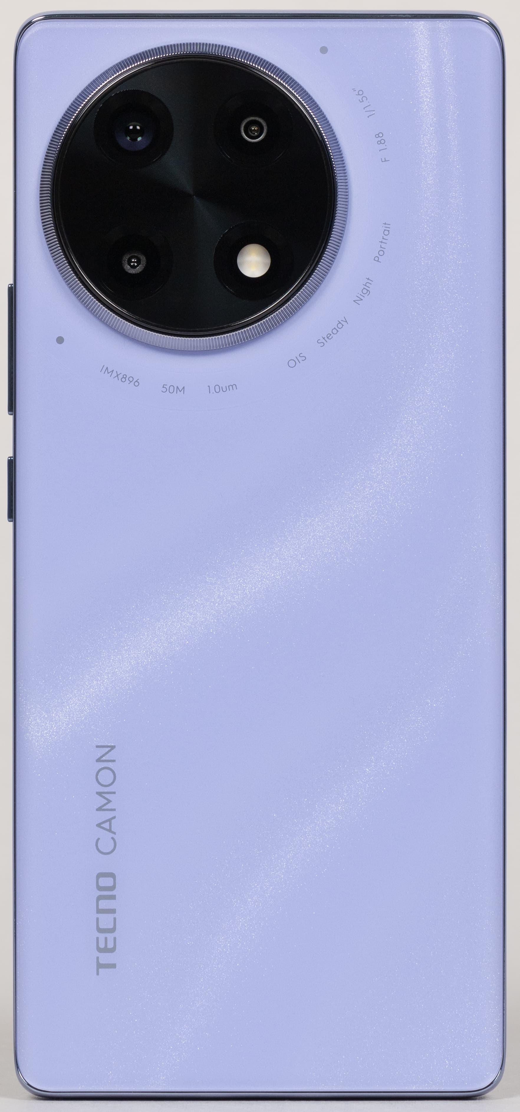Tecno Camon 30S представлен в трех цветах — фиолетовом, черном, золотистом. У варианта оформления «Фиолетовая туманность» есть особенность: задняя панель выполнена из пластика с технологией Sunlight Drawing, под воздействием ультрафиолетовых лучей смартфон меняет цвет на ярко-синий. От влаги и пыли корпус защищен по стандарту IP53, то есть это легкая защита от брызг и дождя.