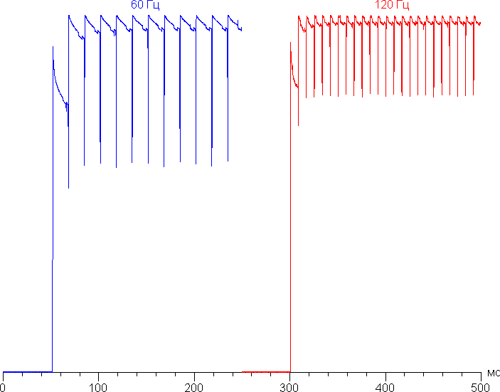 В режиме 120 Гц плавность прокрутки заметно повышается. Посмотрим, изменится ли при этом характер модуляции: