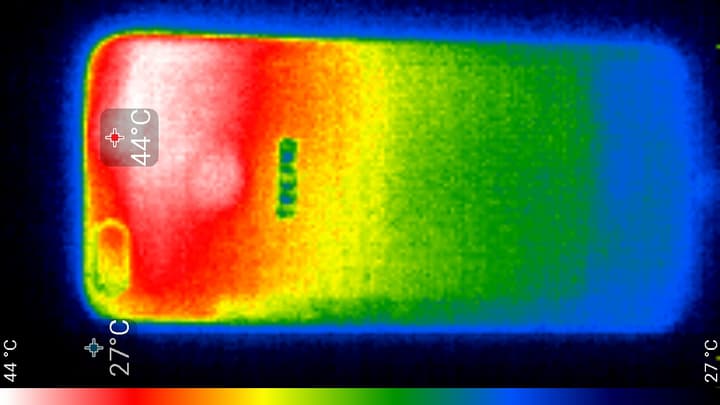 Нагрев локализован в верхней левой части аппарата, что, видимо, соответствует расположению микросхемы SoC. По данным теплокамеры, максимальный нагрев составил 44 градуса (при температуре окружающего воздуха в 24 градуса), это выше среднего значения в данном тесте для современных смартфонов.