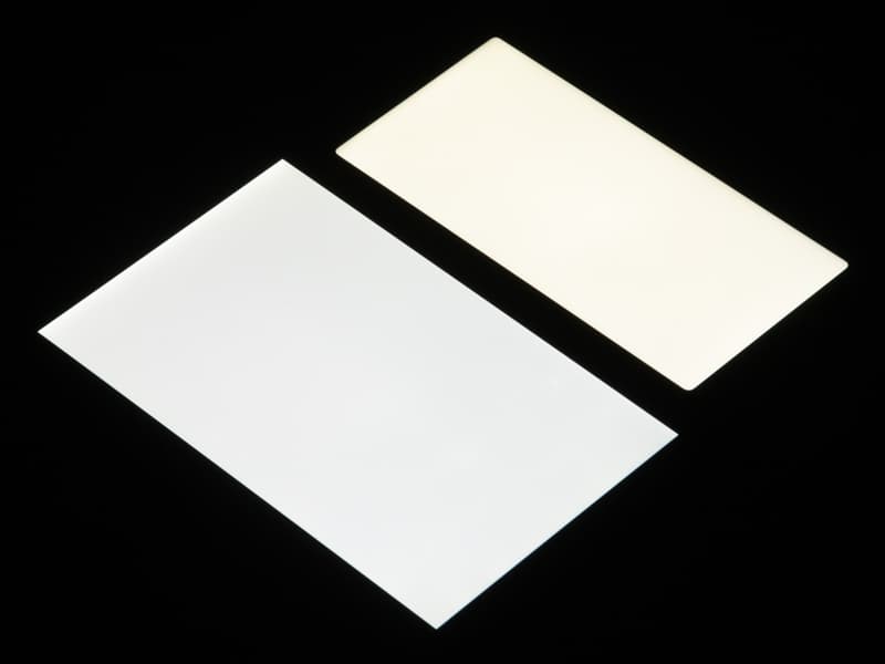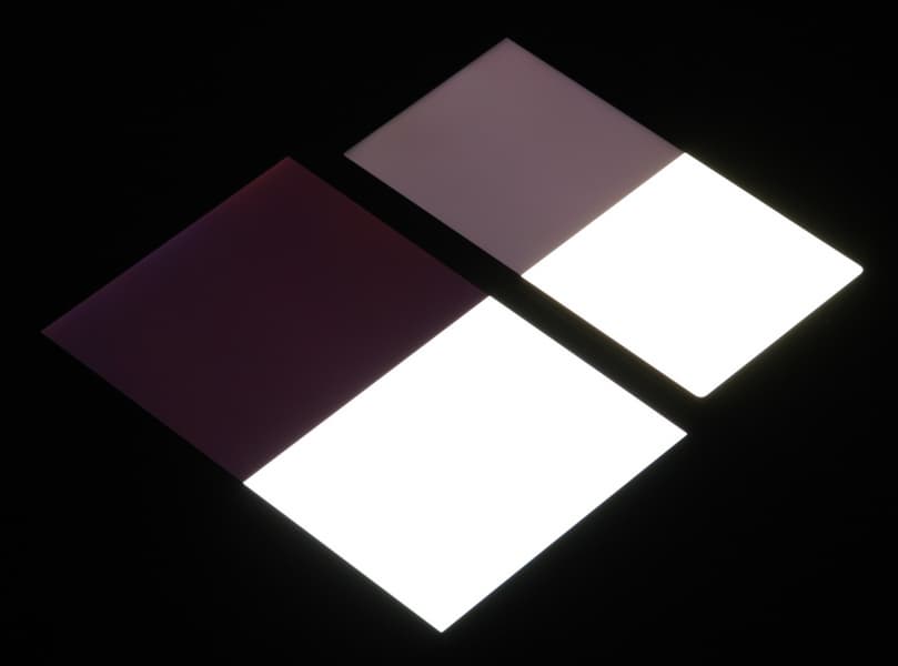 Черное поле при отклонении по диагонали сильно высветляется и приобретает красноватый или красно-фиолетовый оттенок. Фотографии ниже это демонстрируют (яркость белых участков в перпендикулярном плоскости экранов направлении одинаковая!):