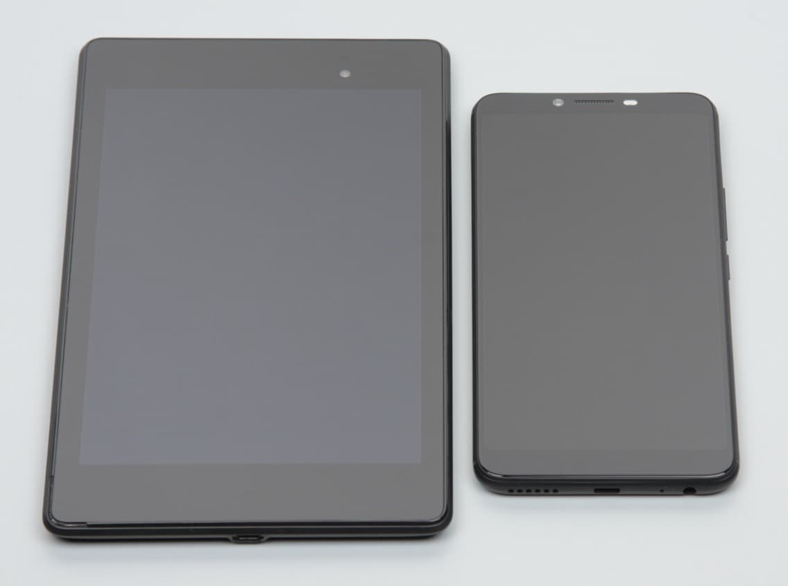 Лицевая поверхность экрана выполнена в виде стеклянной пластины с зеркально-гладкой поверхностью, устойчивой к появлению царапин. Судя по отражению объектов, антибликовые свойства экрана лучше, чем у экрана Google Nexus 7 (2013) (далее просто Nexus 7). Для наглядности приведем фотографию, на которой в выключенных экранах отражается белая поверхность (слева — Nexus 7, справа — Tecno Camon X, далее их можно различать по размеру):