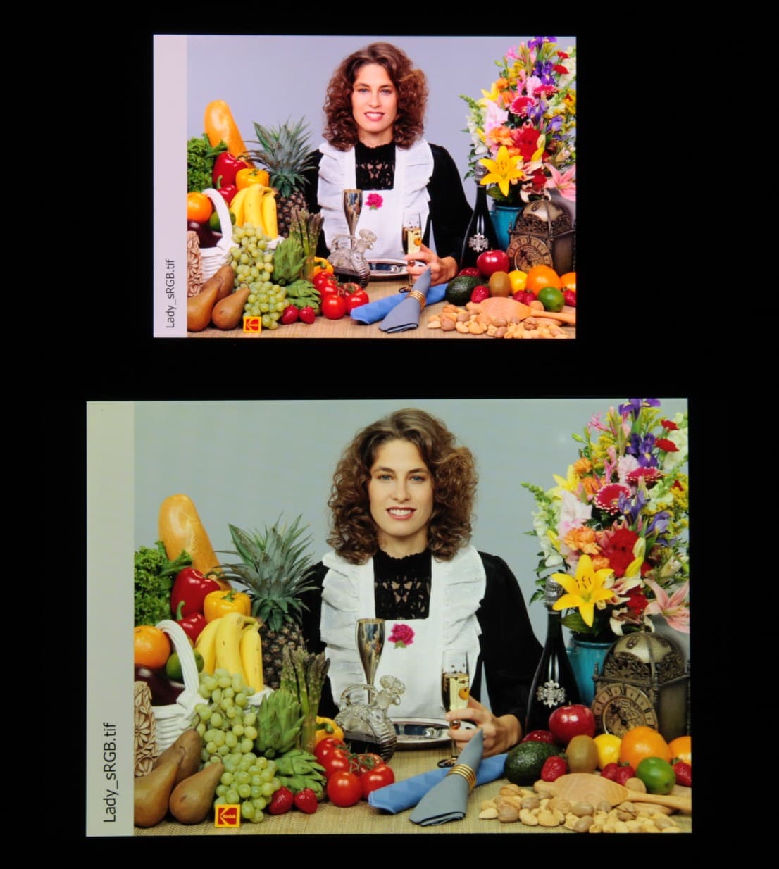 Цвета на экране смартфона перенасыщены (обратите внимание на помидоры, бананы, салфетку и оттенок лица), а цветовой баланс заметно отличается. Напомним, что фотография не может служить надежным источником сведений о качестве цветопередачи и приводится только для условной наглядной иллюстрации. В частности, выраженный красноватый оттенок белого и серого полей, присутствующий на фотографиях экрана смартфона, при перпендикулярном взгляде визуально отсутствует, что подтверждается аппаратными тестами с помощью спектрофотометра. Причина в том, что спектральная чувствительность матрицы фотоаппарата неточно совпадает с этой характеристикой человеческого зрения.
