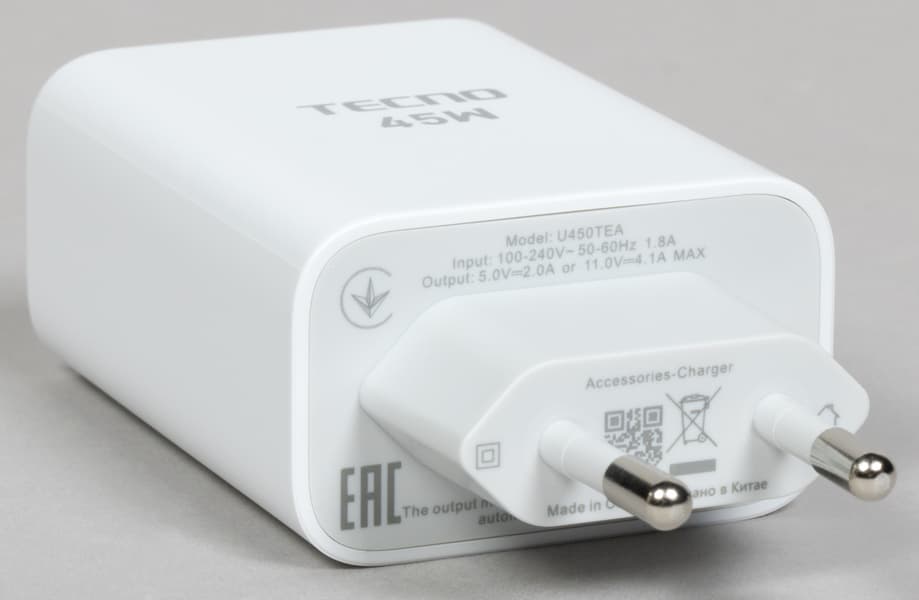 Комплектное сетевое ЗУ имеет максимальную выходную мощность 45 Вт.
