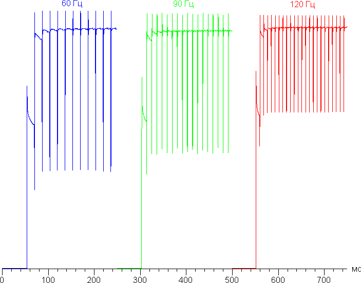 В режимах 90 и 120 Гц плавность прокрутки заметно повышается. Посмотрим, изменится ли при этом характер модуляции. Режим с частотой обновления 90 Гц: