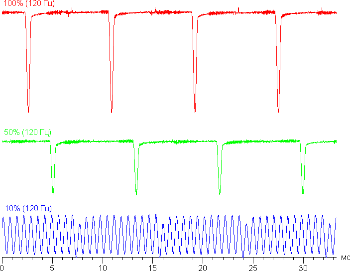 Частота модуляции на высокой и средней яркости увеличилась теперь уже до 120 Гц, а на низкой характер модуляции такой же, что и в случае частоты обновления 60 Гц. Уточним — видимого мерцания нет.