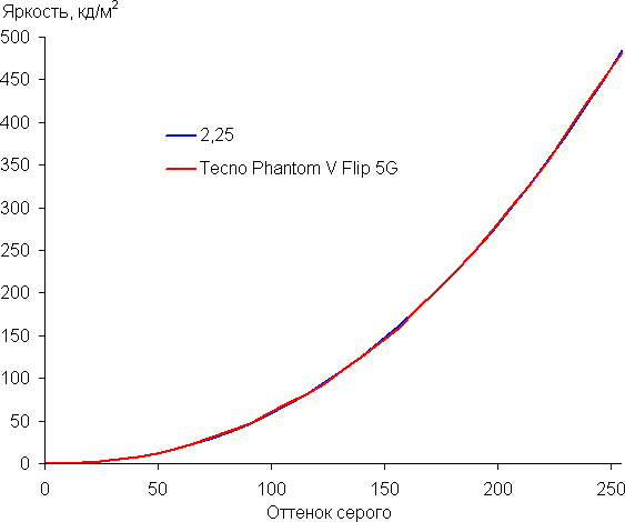 Напомним, что в случае OLED-экранов яркость фрагментов изображения динамично меняется в соответствии с характером выводимого изображения — слегка уменьшается для светлых в целом изображений. В итоге полученная зависимость яркости от оттенка (гамма-кривая), скорее всего, немного не соответствует гамма-кривой статичного изображения, так как измерения проводились при последовательном выводе оттенков серого почти на весь экран.