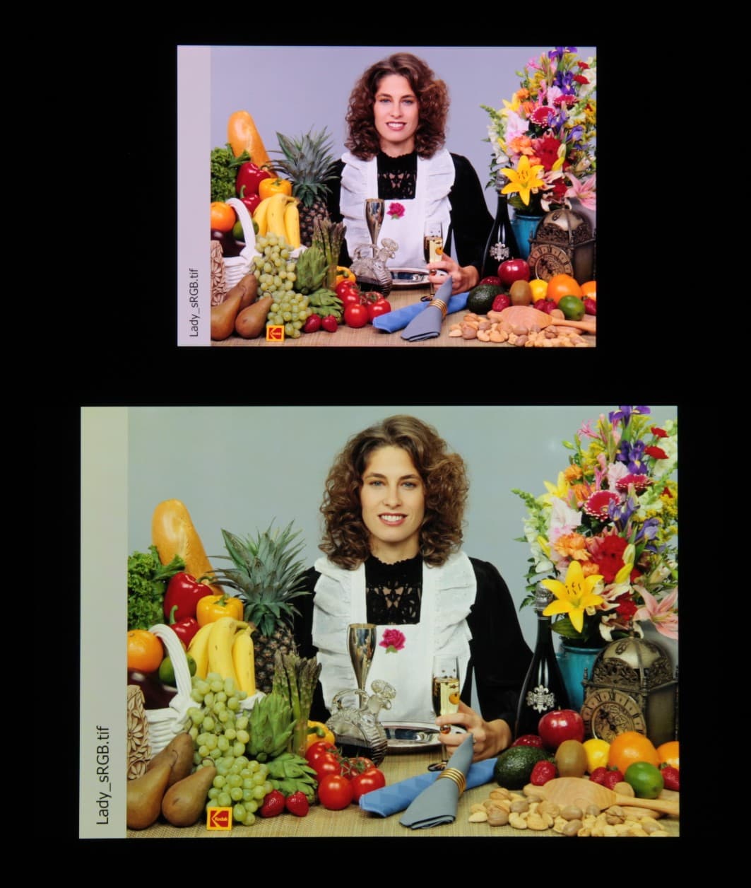 Баланс оттенков на шкале серого компромиссный, так как цветовая температура существенно выше стандартных 6500 К, но хотя бы отклонение от спектра абсолютно черного тела (ΔE) ниже 10 единиц, что для потребительского устройства считается приемлемым показателем. При этом цветовая температура и ΔE мало изменяются от оттенка к оттенку — это положительно сказывается на визуальной оценке цветового баланса: