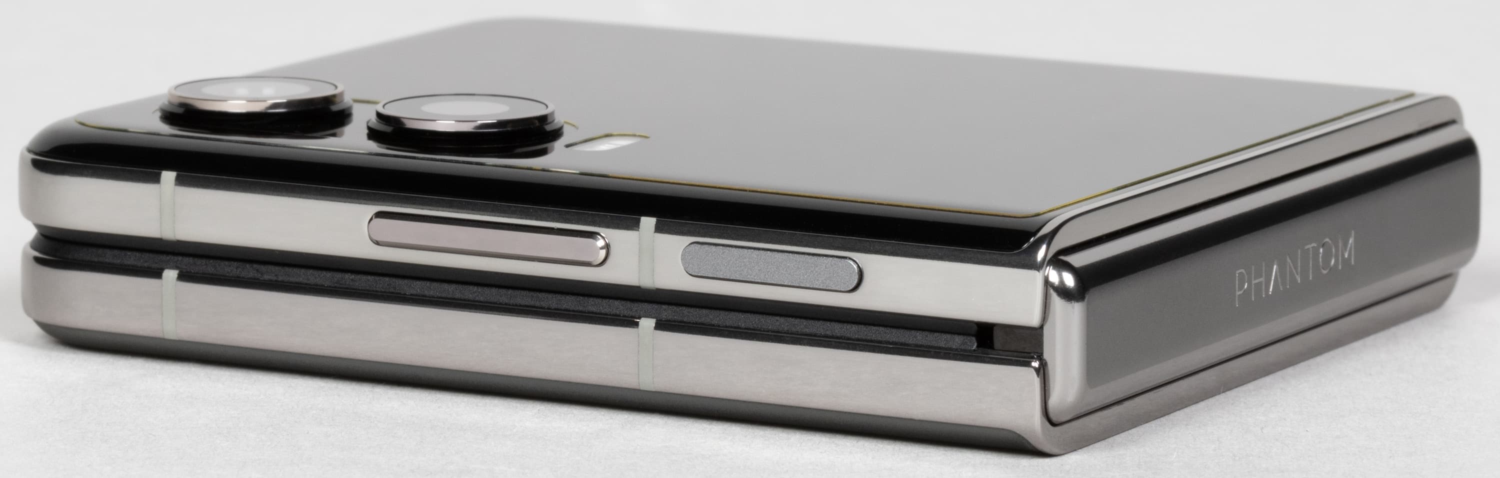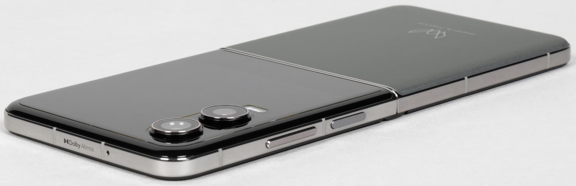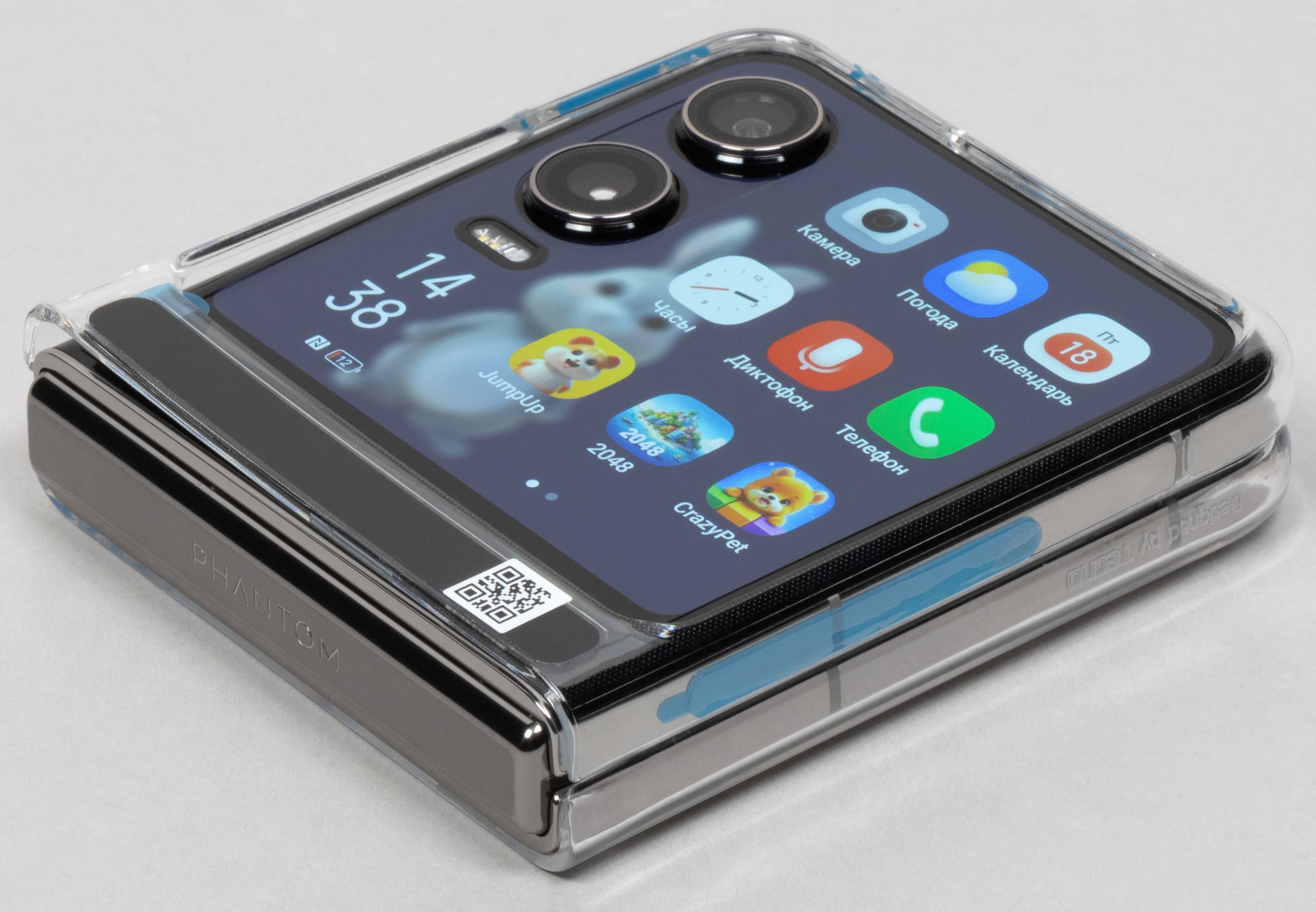 Смартфон Tecno Phantom V Flip2 5G выполнен в форм-факторе вертикальной раскладушки. У нее створки корпуса раскладываются не как у книжки, а как у стандартных телефонов-раскладушек прошлого. Правда, теперь такую «раскладушку» невозможно легко и изящно расхлопнуть одной рукой — приходится каждый раз аккуратно и с определенной долей усилия раскрывать створки с помощью пальцев обеих рук.