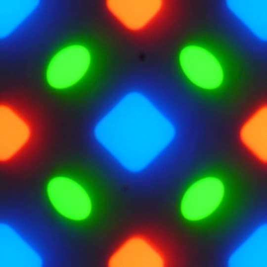 В обоих экранах используется матрица Super AMOLED — активная матрица на органических светодиодах. Полноцветное изображение создается с помощью субпикселей трех цветов — красного (R), зеленого (G) и синего (B), но красных и синих субпикселей в два раза меньше, что можно обозначить как RGBG. Это подтверждается фрагментом микрофотографии: