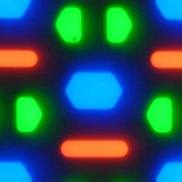 В этом экране используется матрица AMOLED — активная матрица на органических светодиодах. Полноцветное изображение создается с помощью субпикселей трех цветов — красного (R), зеленого (G) и синего (B), но красных и синих субпикселей в два раза меньше, что можно обозначить как RGBG. Это подтверждается фрагментом микрофотографии:
