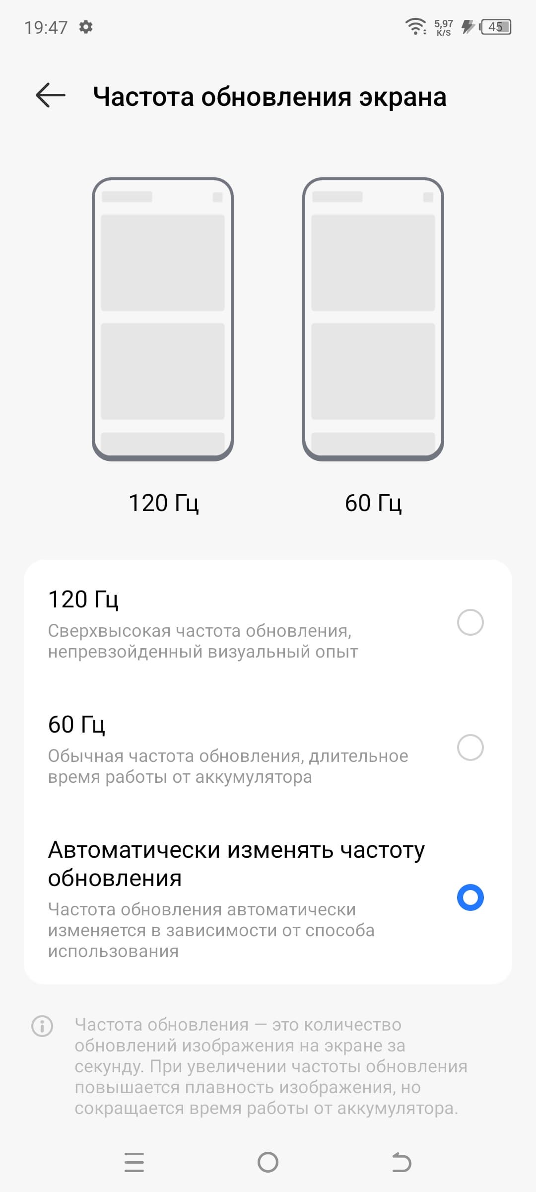 В настройках экрана можно включить режим с повышенной до 120 Гц частотой обновления: