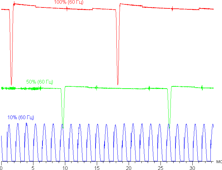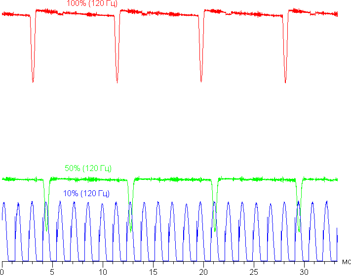 Частота модуляции на высокой и средней яркости увеличилась до 120 Гц, а на низкой характер модуляции такой же, что и в случае частоты обновления 60 Гц. Отметим, что частота повышается до 120 Гц только в случае динамичного изображения, на статичном всегда 60 Гц.