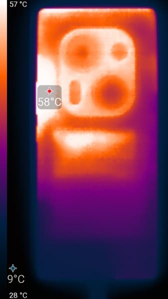 Нагрев больше в правой части аппарата, что, видимо, соответствует расположению микросхемы SoC. По данным теплокамеры, максимальный нагрев составил 58 градусов (при температуре окружающего воздуха в 24 градуса), это очень высокий нагрев в случае данного теста в сравнении с другими современными производительными смартфонами. Во время этого теста корпус смартфона буквально обжигает руки, а экран, видимо из-за перегрева, периодически то снижает, то повышает яркость.