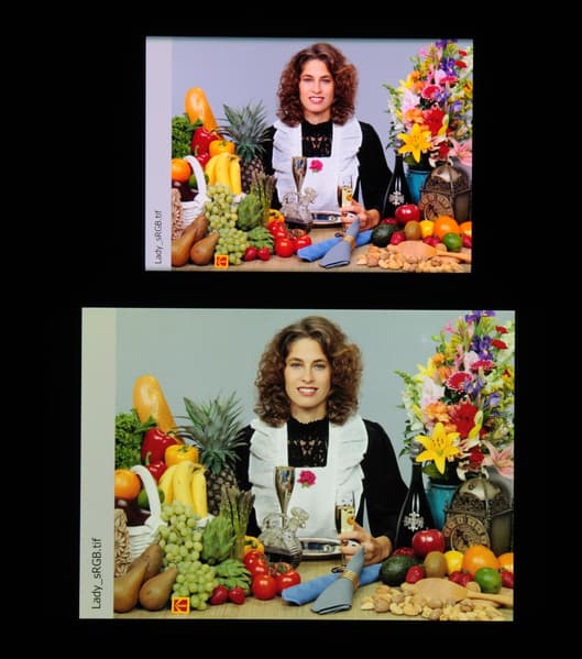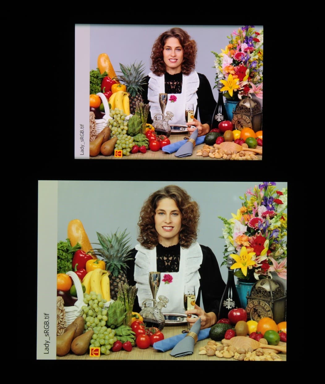 Отметим хорошую равномерность яркости и цветового тона белого поля (за исключением едва видимого затемнения и изменения оттенка к загнутым краям).