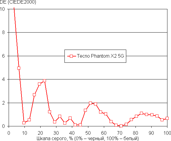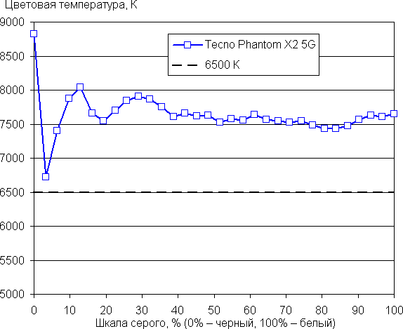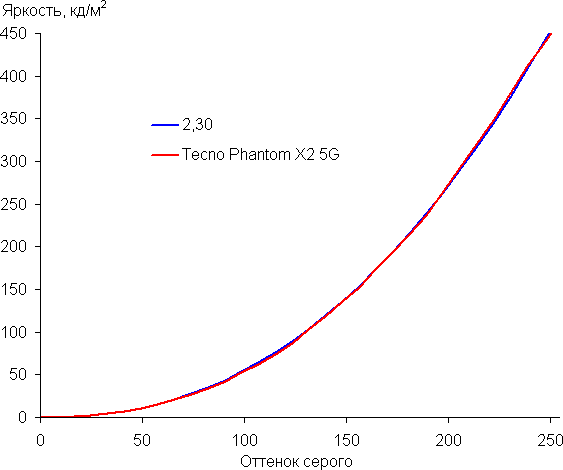 Напомним, что в случае OLED-экранов яркость фрагментов изображения динамично меняется в соответствии с характером выводимого изображения — слегка уменьшается для светлых в целом изображений. В итоге полученная зависимость яркости от оттенка (гамма-кривая), скорее всего, немного не соответствует гамма-кривой статичного изображения, так как измерения проводились при последовательном выводе оттенков серого почти на весь экран.