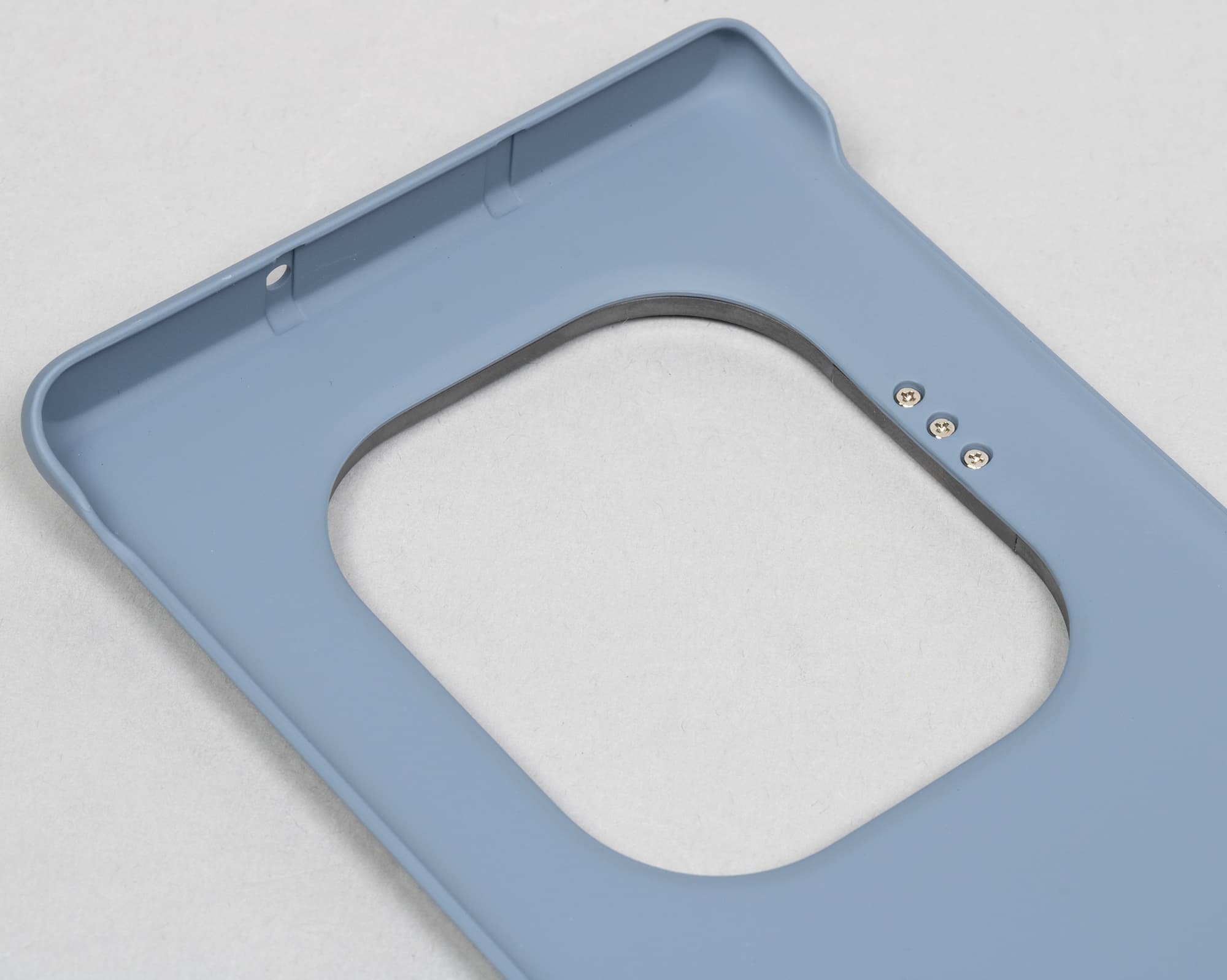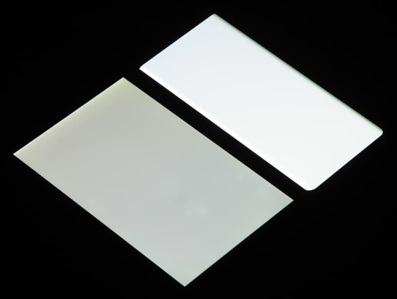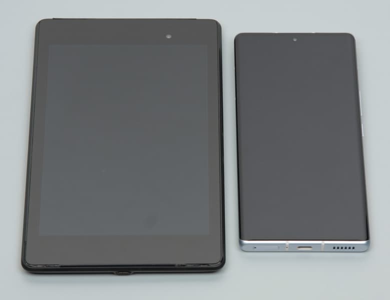 Лицевая поверхность экрана выполнена в виде стеклянной пластины с зеркально-гладкой поверхностью, устойчивой к появлению царапин. Судя по отражению объектов, антибликовые свойства экрана лучше, чем у экрана Google Nexus 7 (2013) (ниже просто Nexus 7). Для наглядности приведем фотографию, на которой в выключенных экранах отражается белая поверхность (слева — Nexus 7, справа — Tecno Phantom X2 5G, далее их можно различать по размеру):