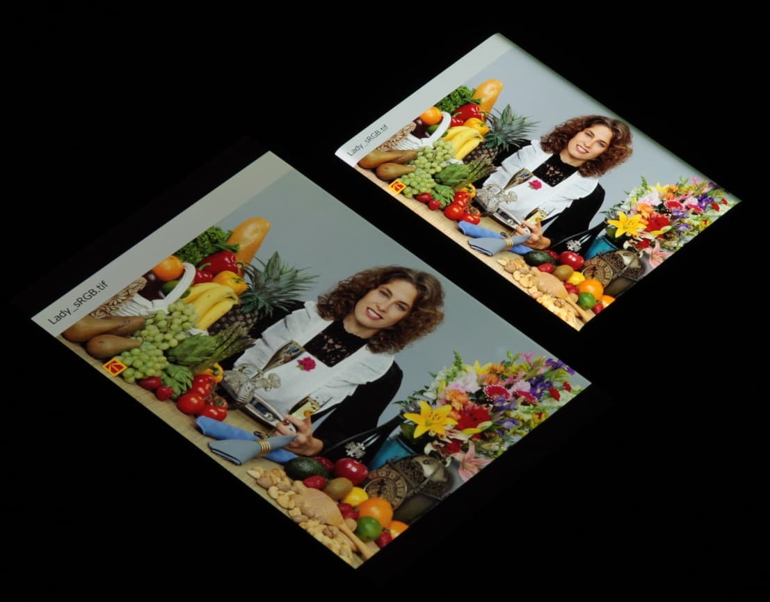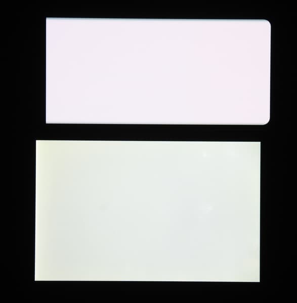 Экран характеризуется великолепными углами обзора. Правда, белый цвет при отклонении на большие углы приобретает легкий сине-зеленый оттенок, но черный цвет остается просто черным под любыми углами. Он настолько черный, что параметр контрастности в данном случае просто неприменим. Для сравнения приведем фотографии, на которых на экраны Tecno Phantom X2 5G и второго участника выведены одинаковые изображения, при этом яркость экранов изначально установлена примерно на 200 кд/м², а цветовой баланс на фотоаппарате принудительно переключен на 6500 К.