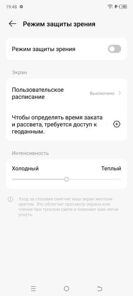 Разумеется, присутствует настройка (Режим защиты зрения), позволяющая снизить интенсивность синей компоненты: