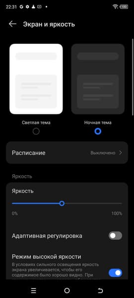 При ручном управлении яркостью и при выводе белого поля во весь экран максимальное значение яркости составило примерно 460 кд/м² в обычных условиях, на очень ярком свету при включенной опции Режим высокой яркости оно повышается до 660 кд/м². Максимальная яркость очень высокая. В данном случае чем меньше площадь белого на экране, тем он светлее, то есть фактическая максимальная яркость белых участков будет почти всегда еще выше. В итоге, учитывая отличные антибликовые свойства, читаемость днем на солнце, должна быть на приемлемом уровне, а темная тема не только экономит заряд аккумулятора, но способствует лучшей разборчивости информации на экране в условиях высокой освещенности. Минимальное значение яркости — 3 кд/м², то есть пониженный уровень яркости без проблем позволяет использовать устройство даже в полной темноте. Есть автоматическая регулировка яркости по датчику освещенности (он находится на фронтальной панели близко к ее верхнему краю правее решетки фронтального громкоговорителя). В автоматическом режиме при изменении внешних условий освещенности яркость экрана как повышается, так и понижается. Работа этой функции зависит от положения ползунка регулировки яркости: им пользователь может попытаться выставить желаемый уровень яркости в текущих условиях. Если оставить все по умолчанию, то в полной темноте функция автояркости уменьшает яркость до 8 кд/м² (темновато), в условиях освещенного искусственным светом офиса (примерно 550 лк) устанавливает на 190 кд/м² (нормально), а условно под прямыми лучами солнца повышает до 660 кд/м² (до максимума, так и нужно; опция Режим высокой яркости включена). Результат нас не совсем устроил, поэтому в полной темноте мы чуть увеличили яркость, получив в итоге для трех условий, указанных выше, следующие значения: 15, 190 и 660 кд/м² (идеальное сочетание). Получается, что функция автоподстройки яркости работает адекватно и позволяет пользователю настраивать свою работу под индивидуальные требования.