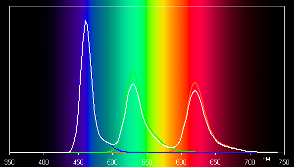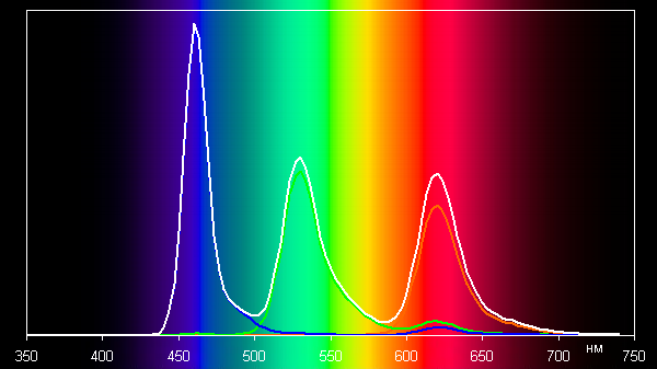 Без коррекции (вариант Яркие цвета) спектры компонент (то есть спектры чистых красного, зеленого и синего цветов) очень хорошо разделены: