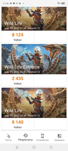 | 3DMark Wild Life Vulkan (больше — лучше) | 8140 | 8276 | 6642 | 4239 | 2322 |