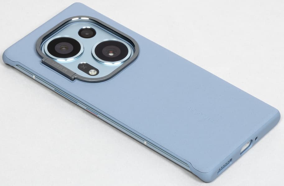 Комплектный чехол полностью преображает аппарат внешне. Насколько скользкая спинка у самого смартфона, настолько шероховатая, словно крупная «наждачка», поверхность у чехла. К тому же, он оборудован откидывающейся мощной металлической рамкой, которая играет роль подпорки. Она, безусловно добавляет толщины всей конструкции, но идея с рамкой хорошая.