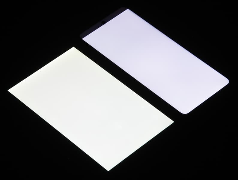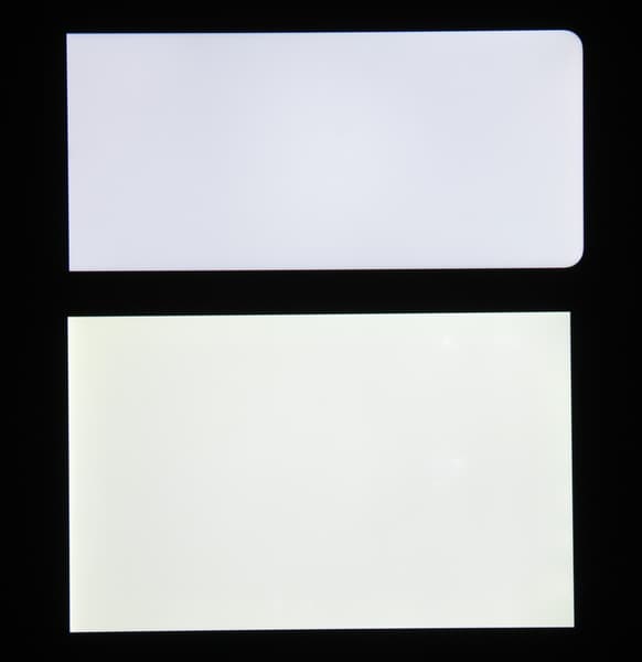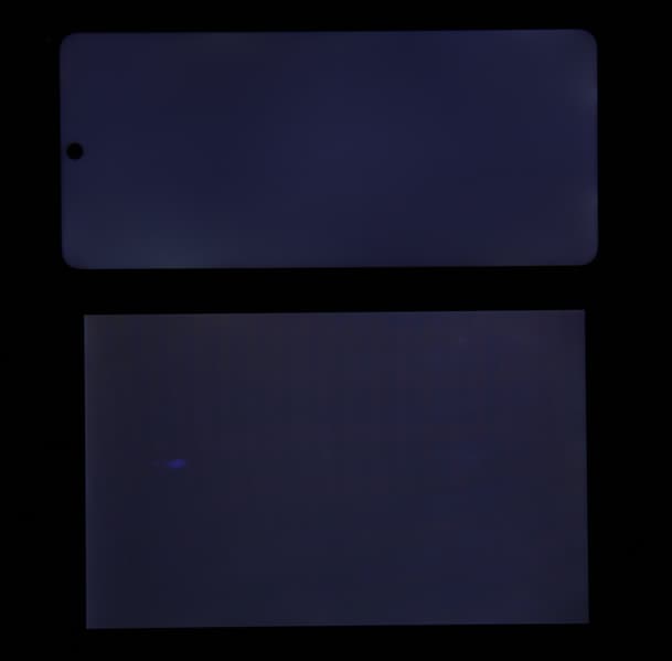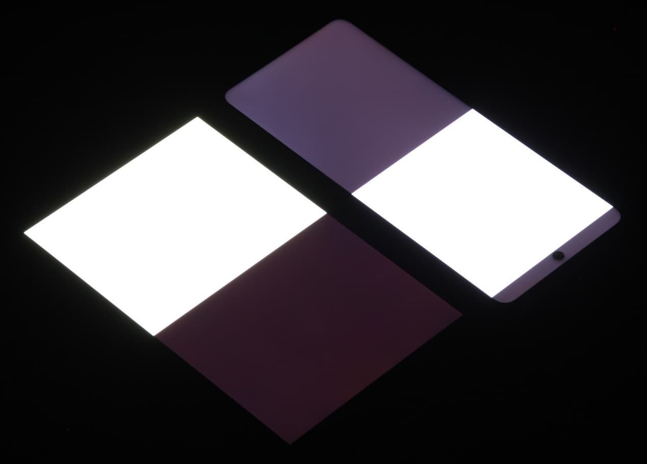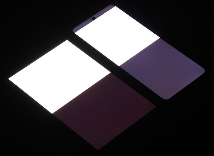 Яркость под углом у экранов уменьшилась (как минимум в 5 раз, исходя из разницы в выдержке), но в случае смартфона яркость снизилась сильнее. Черное поле при отклонении по диагонали сильно высветляется и приобретает фиолетовый оттенок. Фотографии ниже это демонстрируют (яркость белых участков в перпендикулярном плоскости экранов направлении одинаковая!):