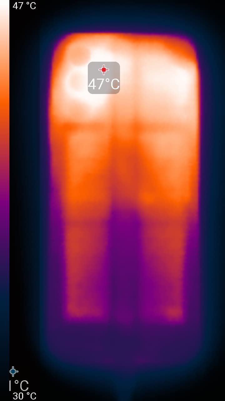 Нагрев выше в верхней части аппарата, что, видимо, соответствует расположению микросхемы SoC. По данным теплокамеры, максимальный нагрев составил 47 градусов (при температуре окружающего воздуха в 24 градуса), это очень сильный нагрев в случае данного теста в сравнении с другими современными смартфонами.